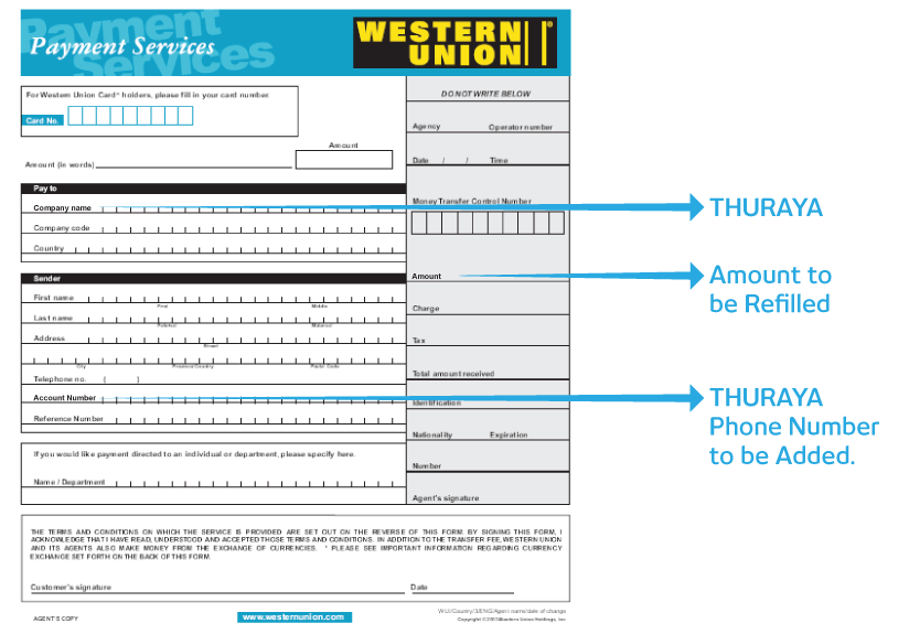 For any enquiries on the Western Union® Quick PaySM service, please contact Thuraya Customer Care at +88216 100 100 or email customer.care@thuraya.com. A member of our team will be contacting you to provide further information and guidance.